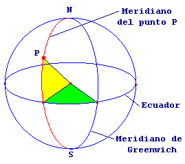 La latitud (en amarillo) es la distancia angular del punto en cuestión al Ecuador, recordemos que a este le corresponde la latitud cero, medida a lo largo de su meridiano (en rojo). Cuando el ángulo representado por la latitud se localiza por encima del Ecuador, es decir en el hemisferio Norte de la tierra, se integra a la coordenada la inicial N.